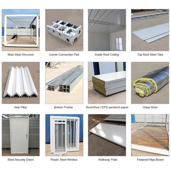 This portable accommodation is made of light steel as steel structure and sandwich panels for wall and roof. The insulation of the sandwich panel can be polystyrene, polyurethane, rock wool, and fiberglass. As a standardized construction product, it has below main features: no construction garbage caused; Environment protective materials adopted, repeated use and low cost; Flexible size and easy to assemble and disassemble with elegant appearance; Safe and durable. It is suitable for temporary buildings such as a dormitory, canteen, recreation room, washing room, etc...